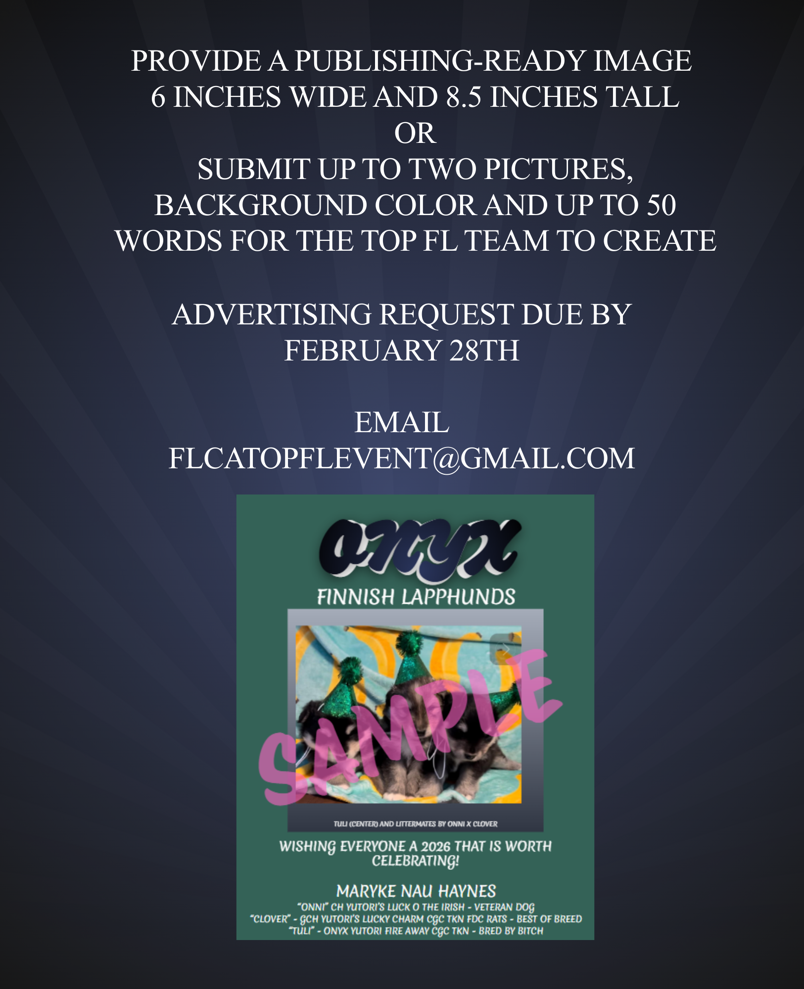 - Submit up to two pictures, background color preference and 50 words to be designed by the Top FL Team. Hyperlinks to Websites, Facebook pages or Breed Archive can be included in the Advertisement. A sample of what we would make is below.