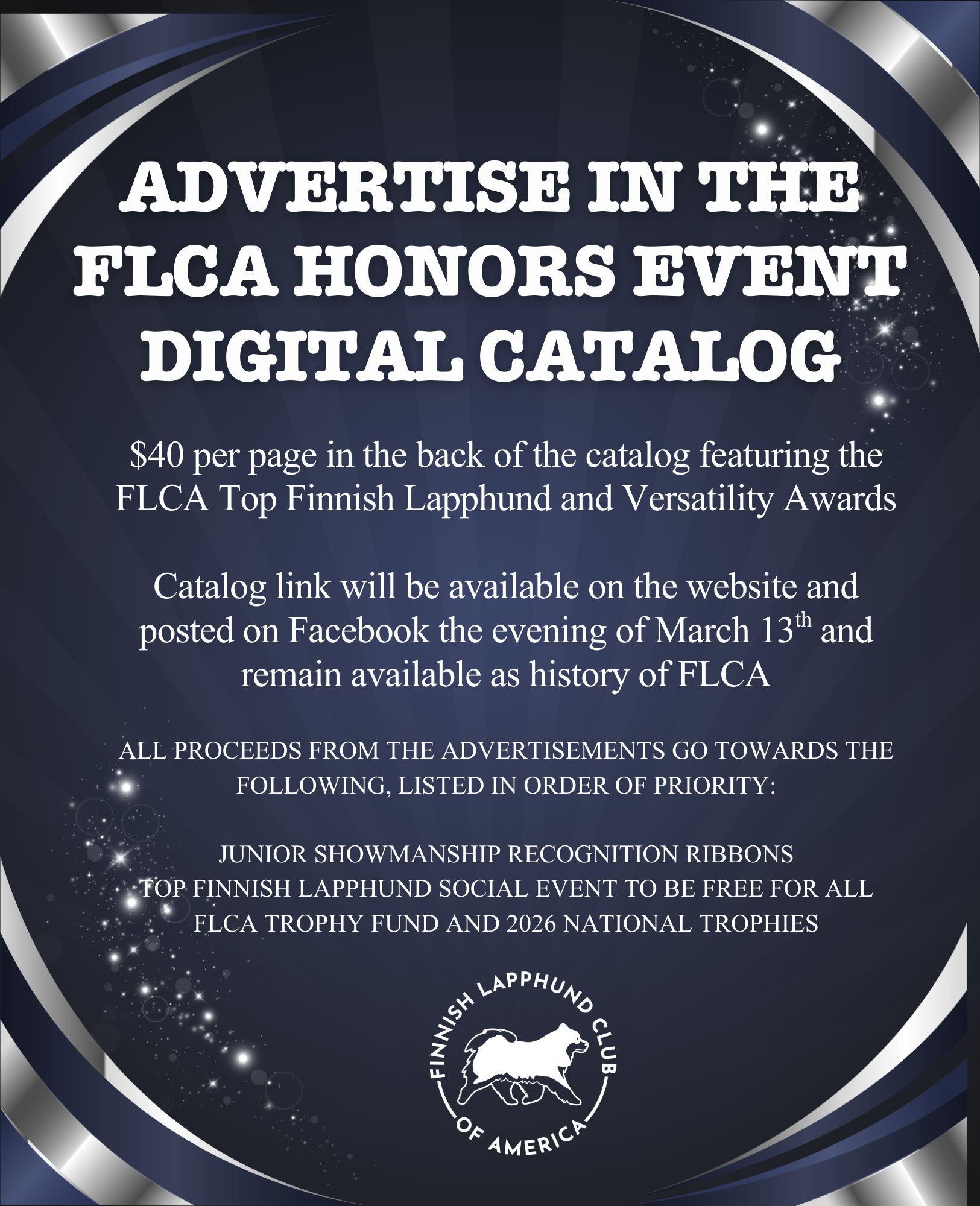 To help cover the cost of the Top Junior Showmanship ribbons and the Social Event for the Top FLs, we are providing an opportunity to include an advertisement in back of the Catalog. Any remaining funds will go to the FLCA Trophy Fund to continue to recognize the success of the Finnish Lapphund.